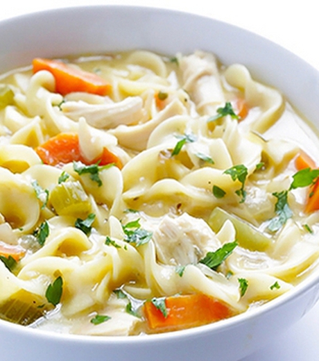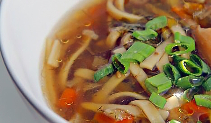 ქვაბში ჩაასხით 2,5 ლიტრი წყალი, მოათავსეთ 1 თავი ხახვი, 1 ცალი სტაფილო, ოხრახუში მთლიანად, პეტრუშკის ძირი, ქათამი და მოხარშეთ ბულიონი. გამზადებული ბულიონი გადაწურეთ, ქათმის ხორცი წვრილად დაჭერით.