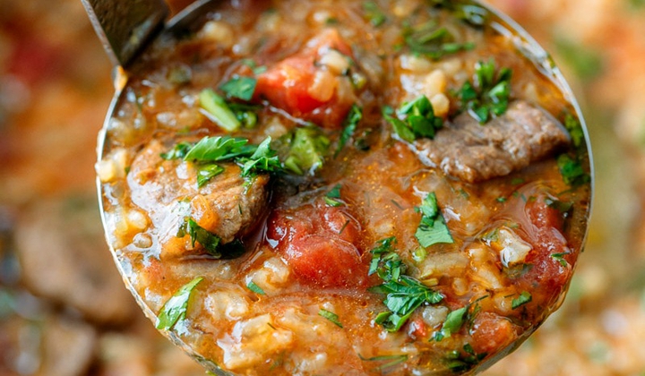 დაუმატეთ წვრილად დაჭრილი პომიდორი, 4 ჭიქა ბულიონი, 4 ჭიქა წყალი, 2 ცალი დაფნის ფოთოლი და შებრაწული საქონლის ხორცი. აადუღეთ, შემდეგ შეამცირეთ ტემპერატურა, დააფარეთ და ადუღეთ დაბალ ტემპერატურაზე 1.5–დან 2 საათამდე, ან ხორცის დარბილებამდე.